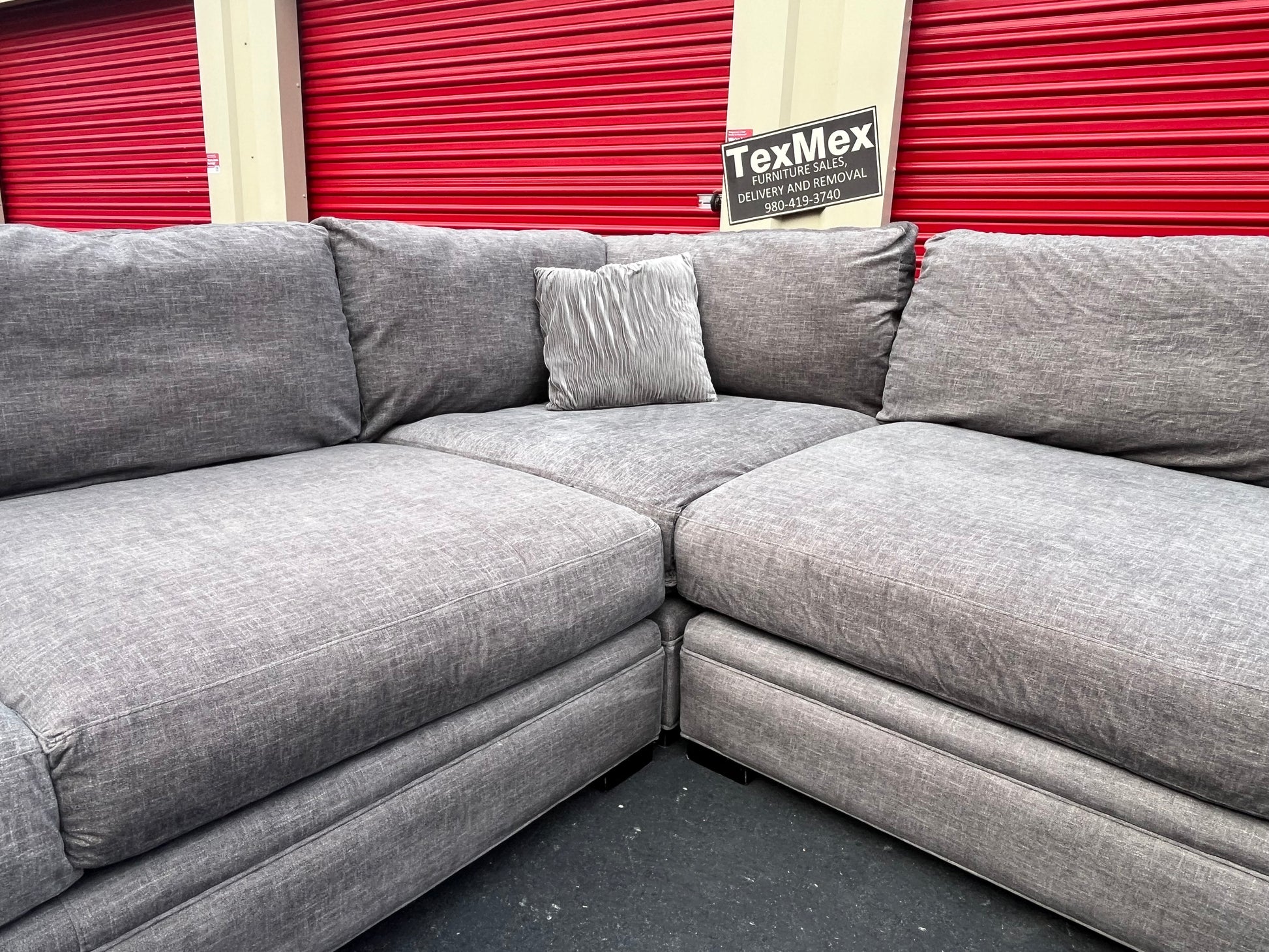 Great condition Palm Springs silver 3Pcs Cindy Crawford sectional with down cushions. 2,800$ in store!